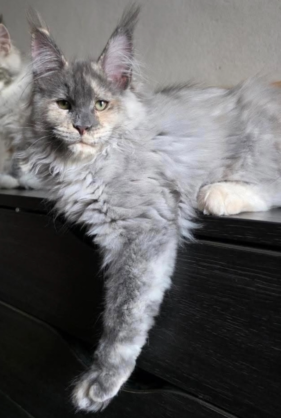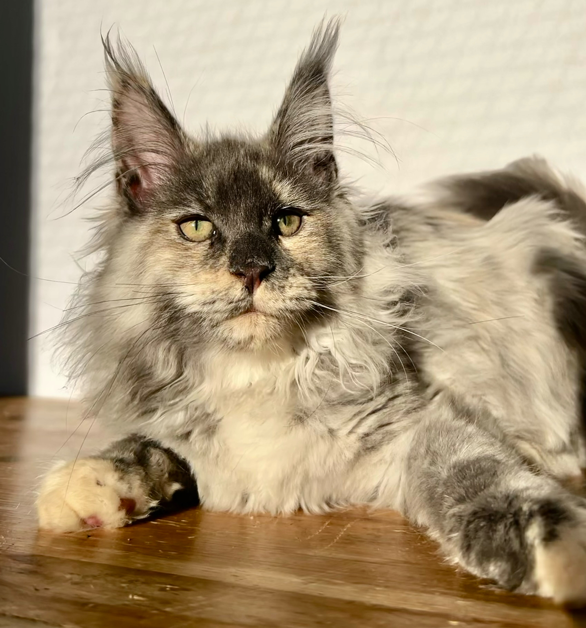 We love Glinda’s wide muzzle and soft pastel colors. She is a blue cream smoke tortie, and right now she’s just a juvenile, but pending testing we will be expecting kittens from her around the Fall of 2026.