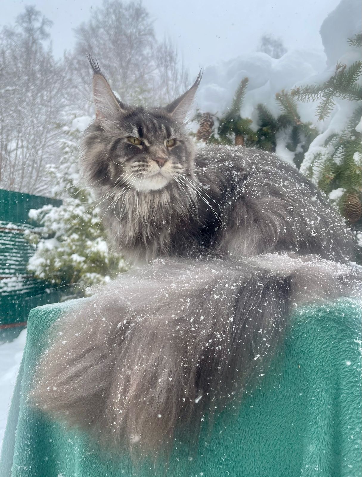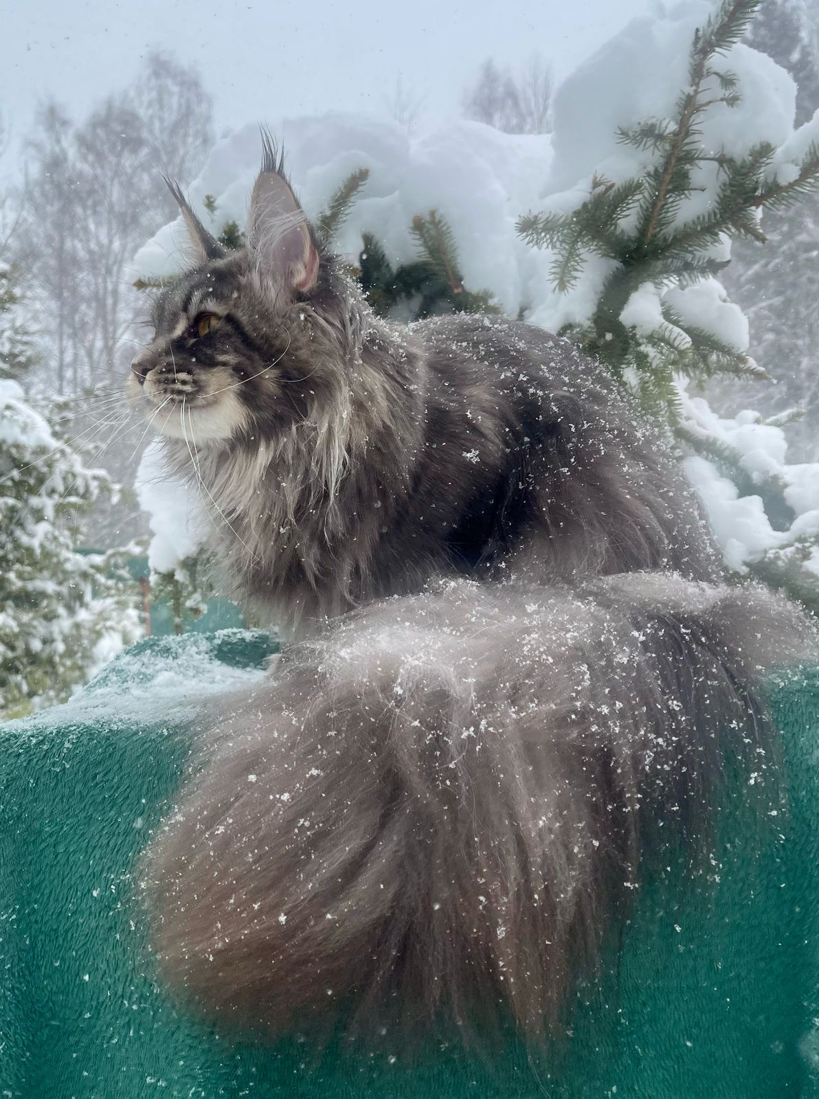 Zara is descended from one of our favorite catteries in Europe (Carma Friend). She has the characteristic fierce gaze, wide muzzle, long ear tufts and fluffy wild mane that is present in the best of the breed. She’s big too! At only a year old she already weighs 14 pounds so we expect her to top out around 18-20 pounds.